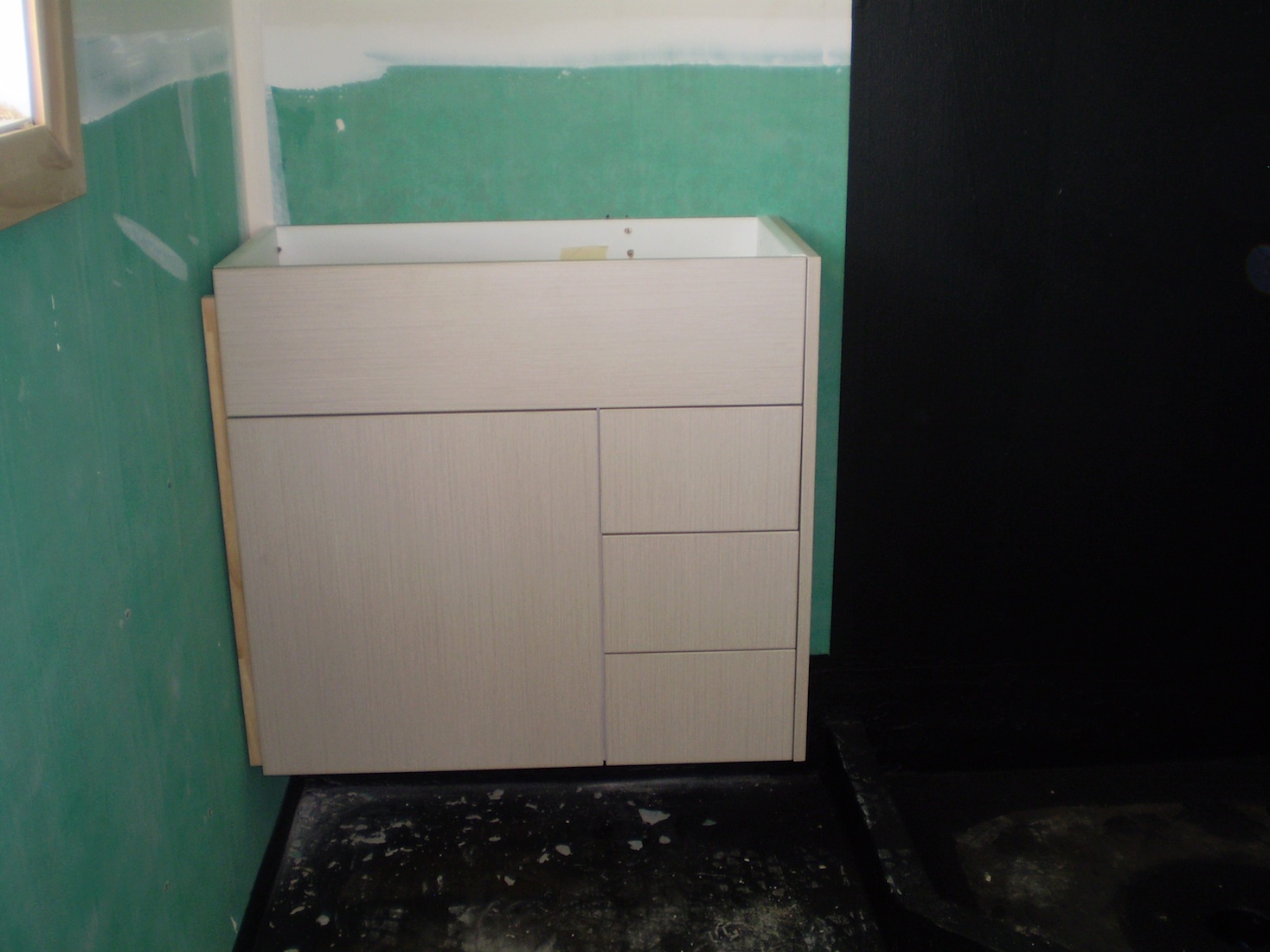 The vanity units and laundry cabinet minus their tops were all installed today. The kitchen was going in and will be completed by this afternoon. Here are some pictures. So excited as I though today (the day I get a new kitchen) would never come.